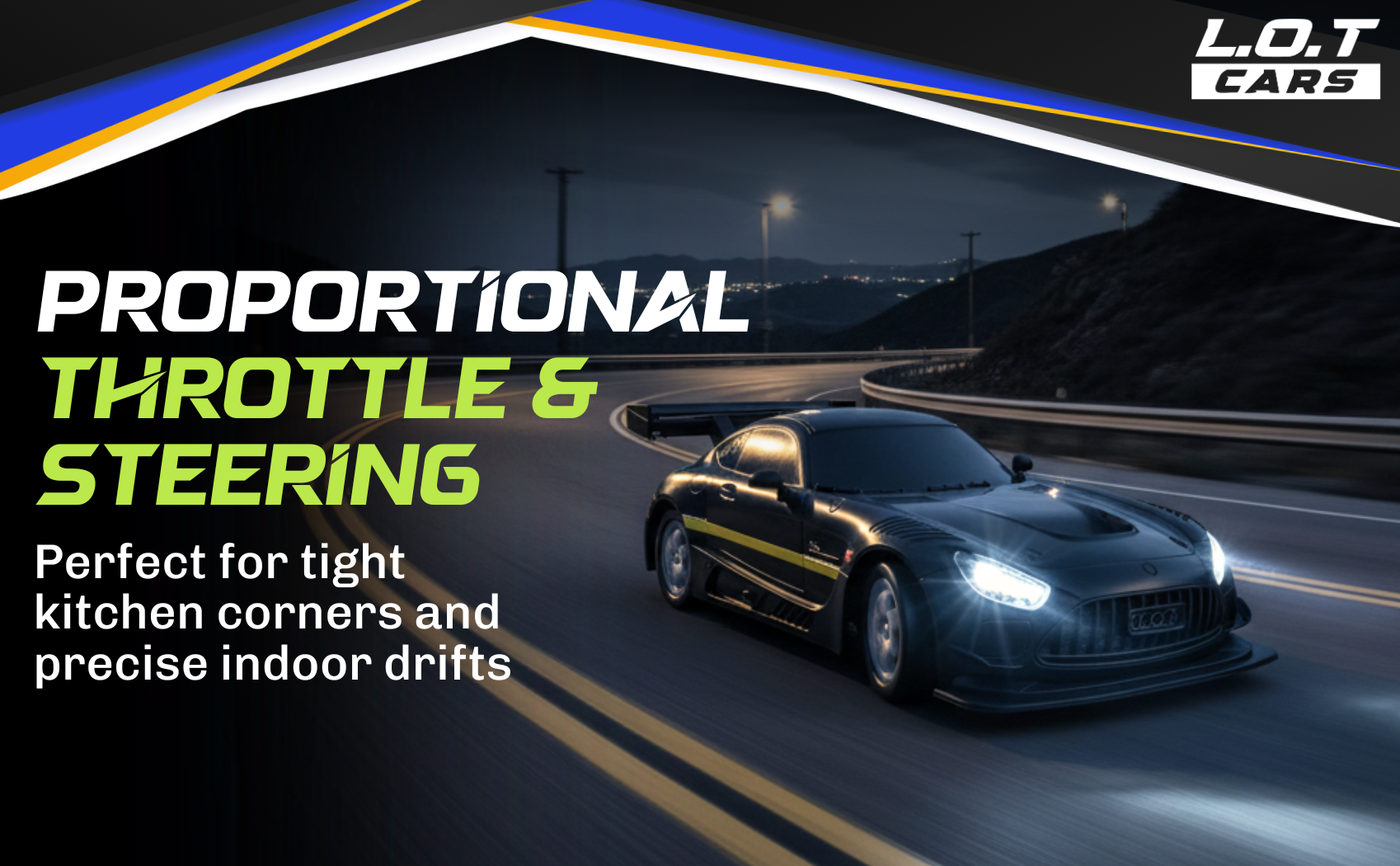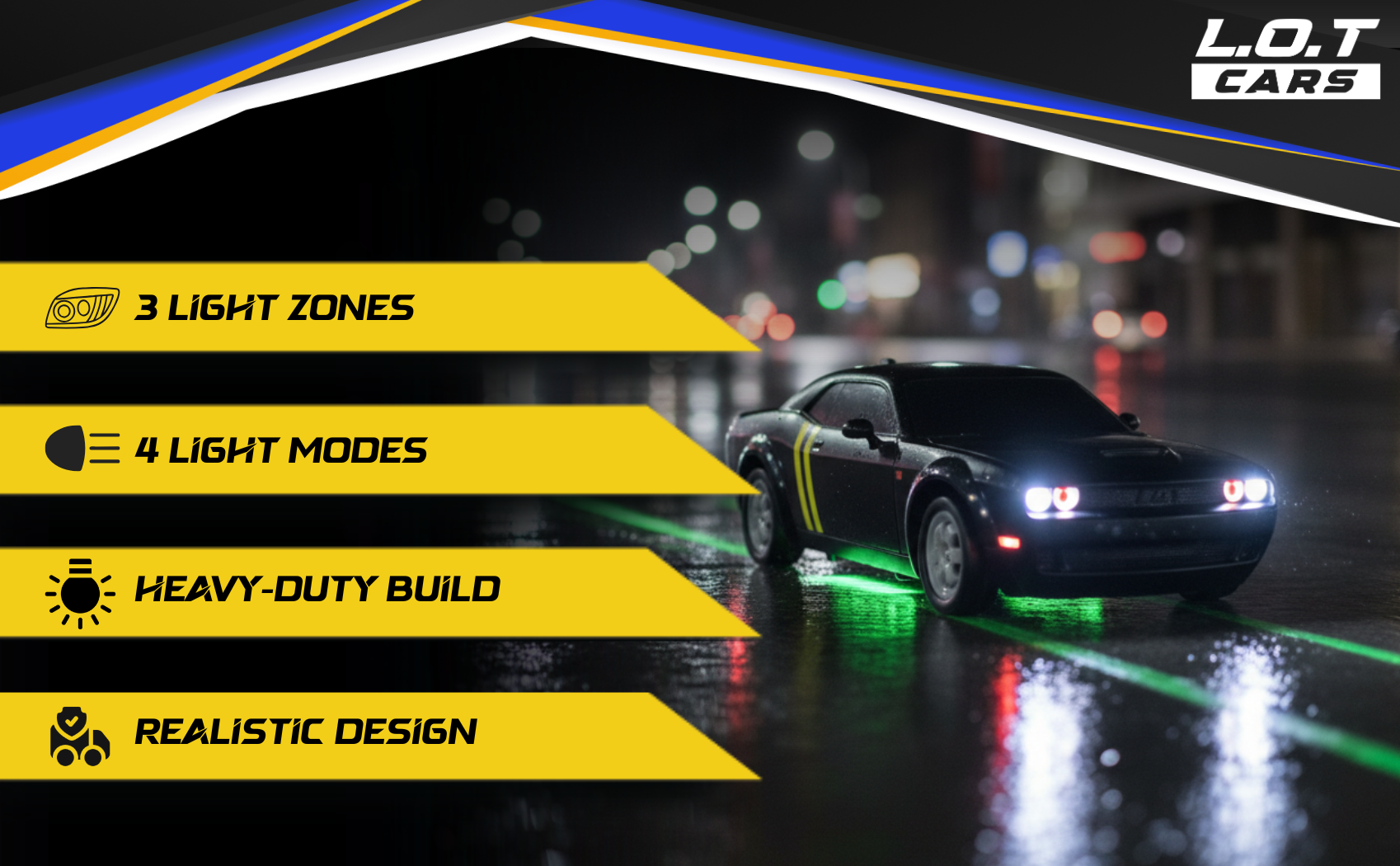 Shadow is built for drivers who live for the slide. Fast, low, and unapologetically aggressive, this RC drifter hits speeds of up to 20 kmph with dual speed modes that let you switch from controlled practice to full send in seconds. Proportional throttle and steering give you smooth, confident control, while four wheel drive keeps Shadow planted even when the rear is fully out.Drift tyres come ready for sideways chaos, with replaceable grip tyres when you want sharper lines and tighter runs. The lightweight, high-quality plastic body is made to take hits and keep pushing. As the lights come on, headlights, underglow, and spoiler lights transform every run into a spectacle, with multiple lighting modes that own the night.Paired with a long-range 2.4 GHz gun-style remote, Shadow stays locked in, responsive, and relentless. Built to drift. Built to dominate. Shadow doesn’t chase the line. He breaks it.